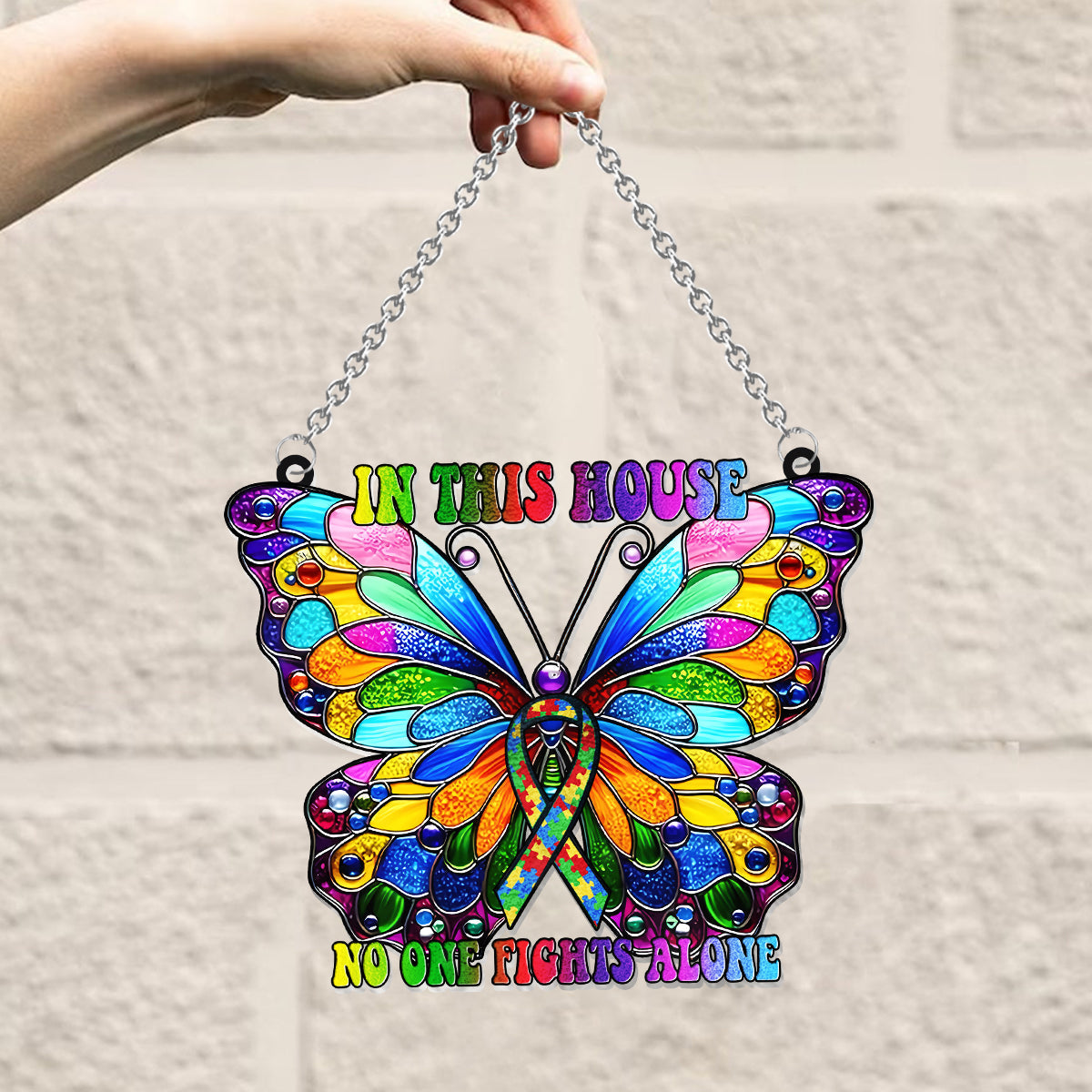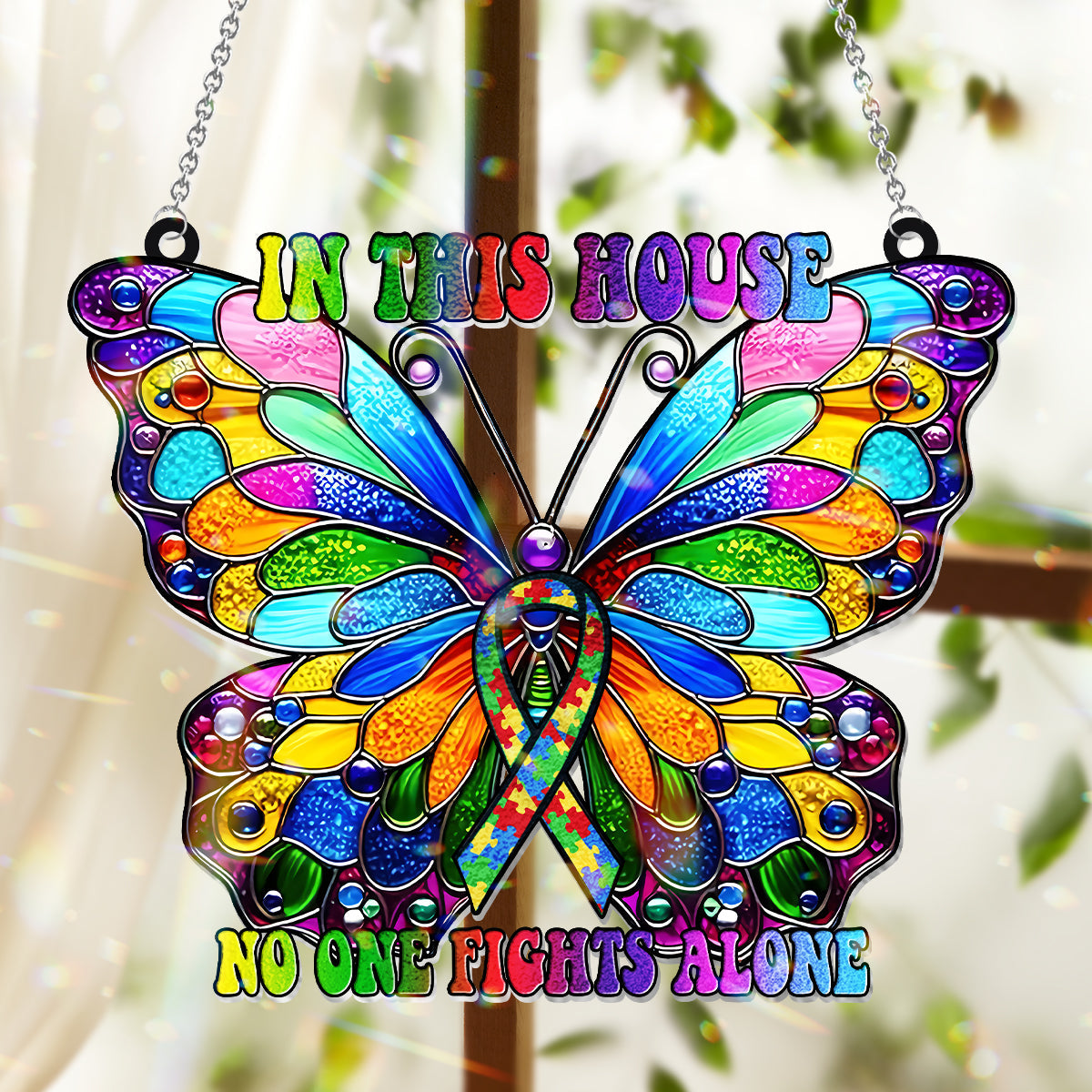 Dans cette maison, personne ne se bat seul - Attrape-soleil décoratif à suspendre à la fenêtre pour la sensibilisation à l'autisme